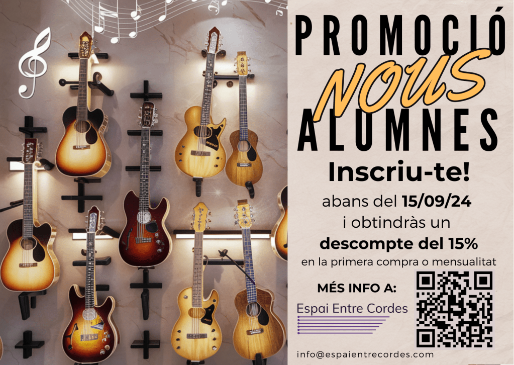 Apunta’t avui mateix i aprofita el 15% de descompte abans que acabi la promoció el 15 de setembre de 2024. No deixis escapar aquesta oportunitat per iniciar el teu viatge musical amb nosaltres.